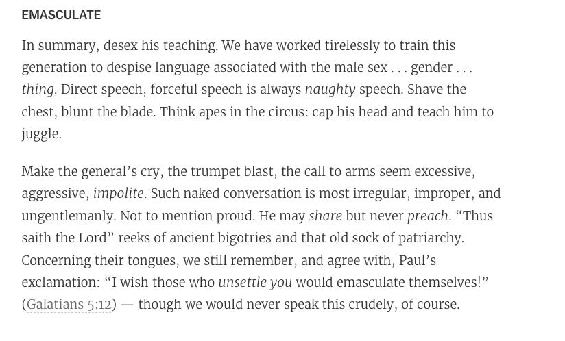For instance, Greg Morse’s increasingly stupid column features Globdrop out in seminaries trying to make the men into sissies.