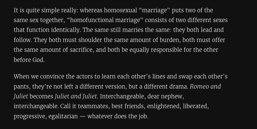 Globdrop is able to articulate what a demonic marriage looks like from his perspective, but can’t really say why it’s bad. He knows it’s bad though, because Greg Morse knows it’s bad, and knows why it’s bad. It’s not correct. The fact that this marriage can bring about love for God and love for neighbor isn’t relevant information. Greg Morse doesn’t care about love for God or neighbor. Greg cares about who is right and who is wrong. Greg is right. People who aren’t like Greg are wrong. Demons want people to be less like Greg and more like other people. And so, this is what Globtrob cares about.